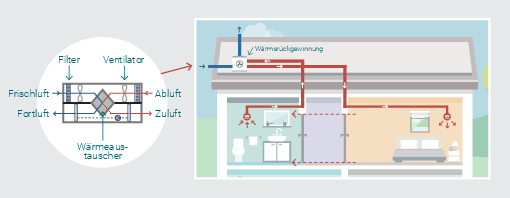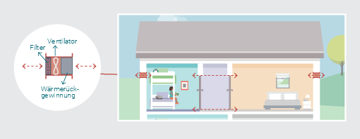 Zentrale Zu- und Abluftanlagen bieten den größten Wohnkomfort von allen automatischen Lüftungsanlagen. Das Lüftungszentralgerät ist meist im Keller oder auf dem Dachboden installiert. Es saugt verbrauchte Raumluft aus Küche, Bad und WC ab und leitet lautlos Frischluft in die Wohnräume. Ein Wärmetauscher in der zentralen Lüftungseinheit sorgt dafür, dass die (kalte) Frischluft durch die warme Abluft vorgewärmt wird und so im Winter nur 10 % der Raumwärme verloren gehen. Im Sommer bleibt dafür Hitze überwiegend draußen. Außerdem können hocheffektive Pollen- und Feinstaubfilter eingesetzt werden.