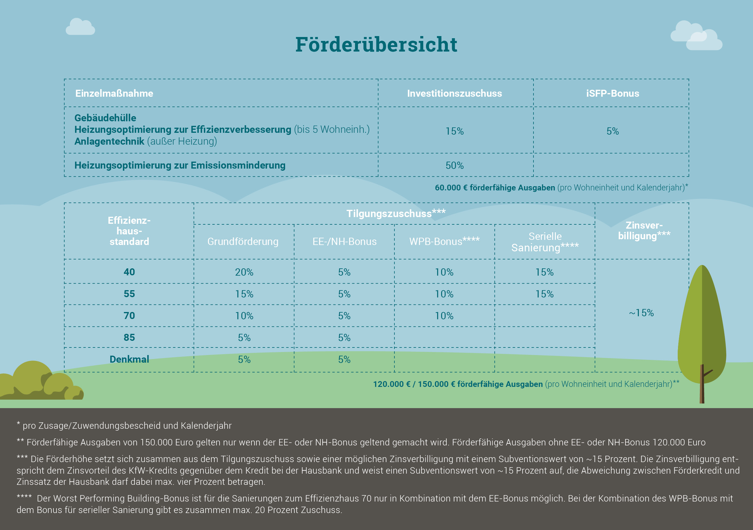 Die Grafik bietet einen Überblick über die verschiedenen Fördersätze und Boni bei der Sanierung zum Effizienzhaus.