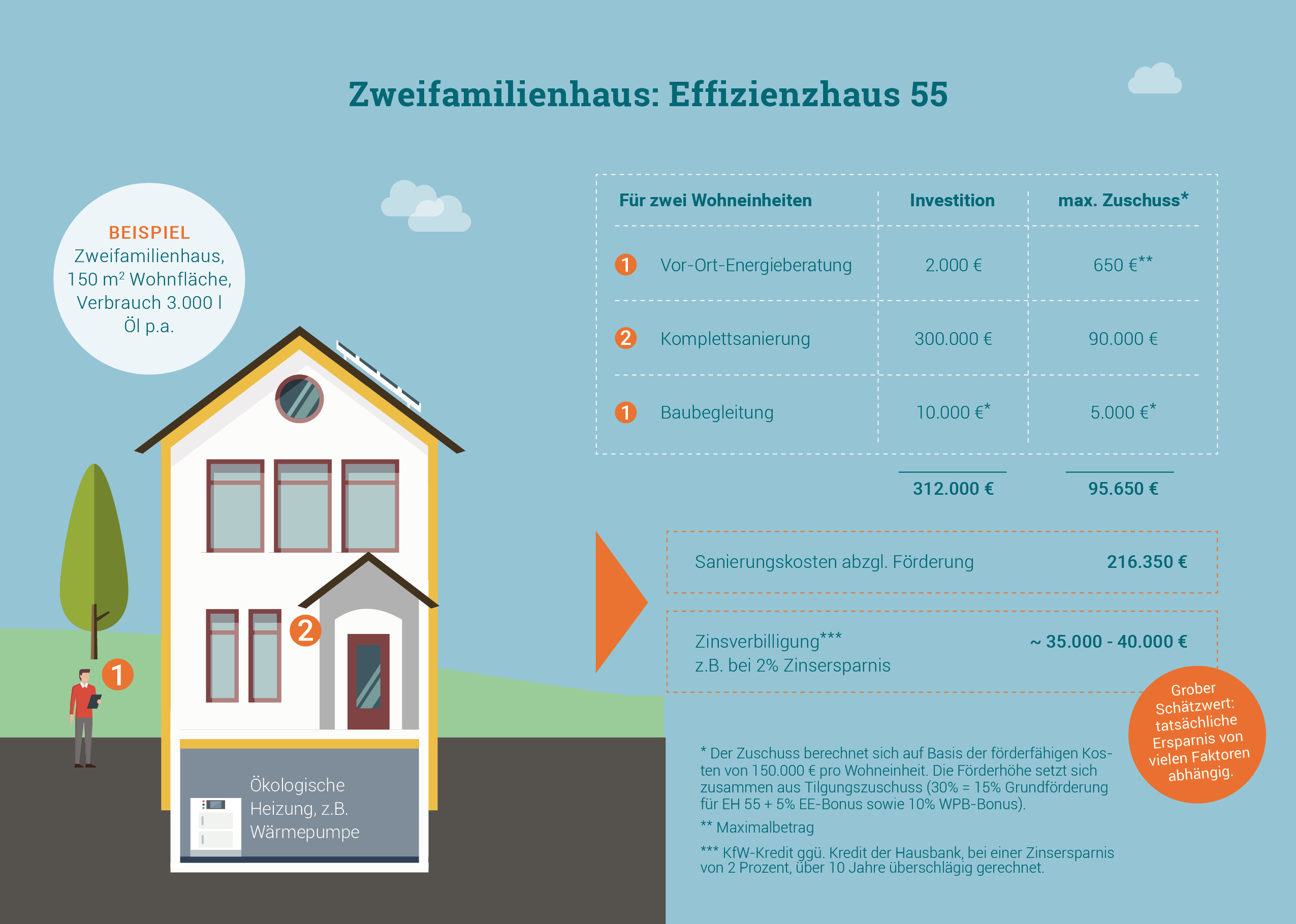 Die Grafik zeigt beispielhaft, wie die Sanierungskosten und Fördermittel bei einer Sanierung zum Effizienzhaus 55 aussehen könnten.