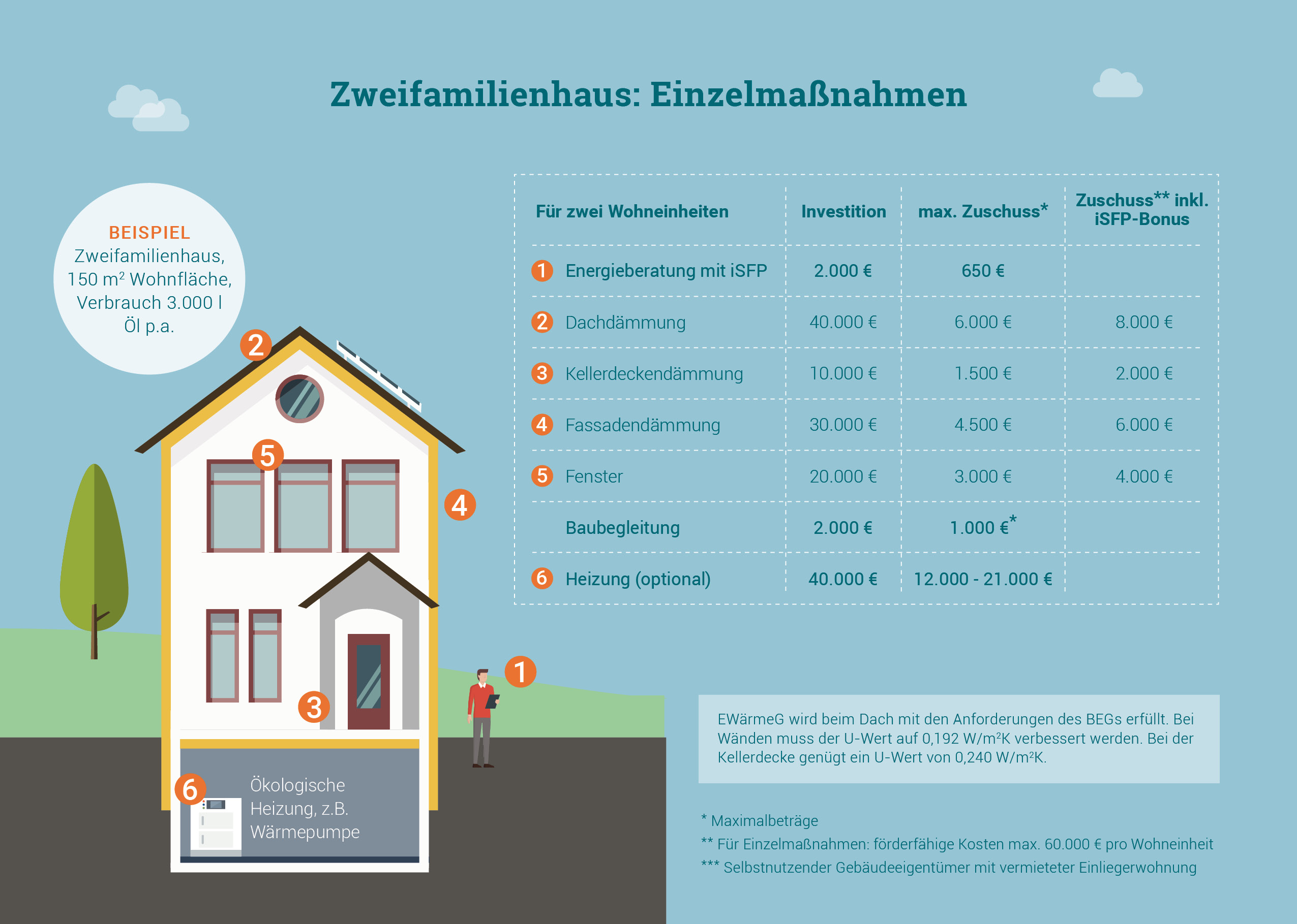 Die Grafik zeigt, welche Förderungen für Einzelmaßnahmen bei der energetischen Sanierung Hauseigentümerinnen und Hauseigentümer in Anspruch nehmen können.