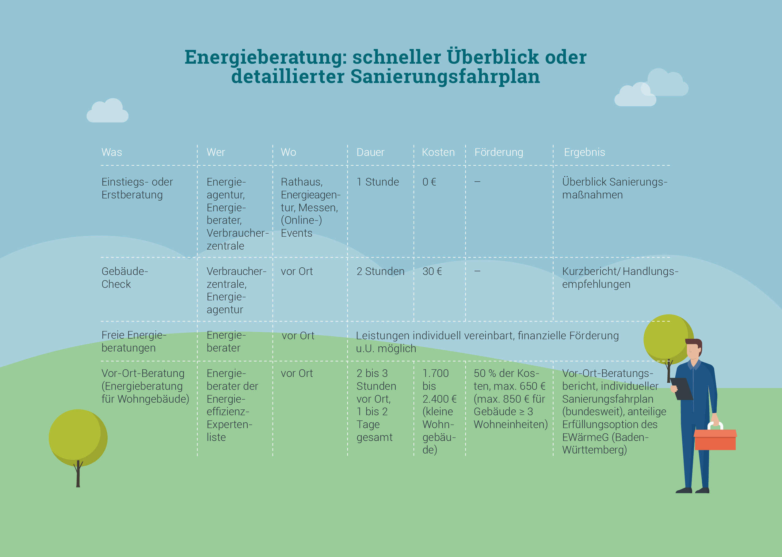 Die Grafik liefert einen Überblick über verschiedene Energieberatungsangebote und gibt Auskunft über die jeweiligen Anbieter, Kosten, Förderungen sowie die Dauer und das Ergebnis.