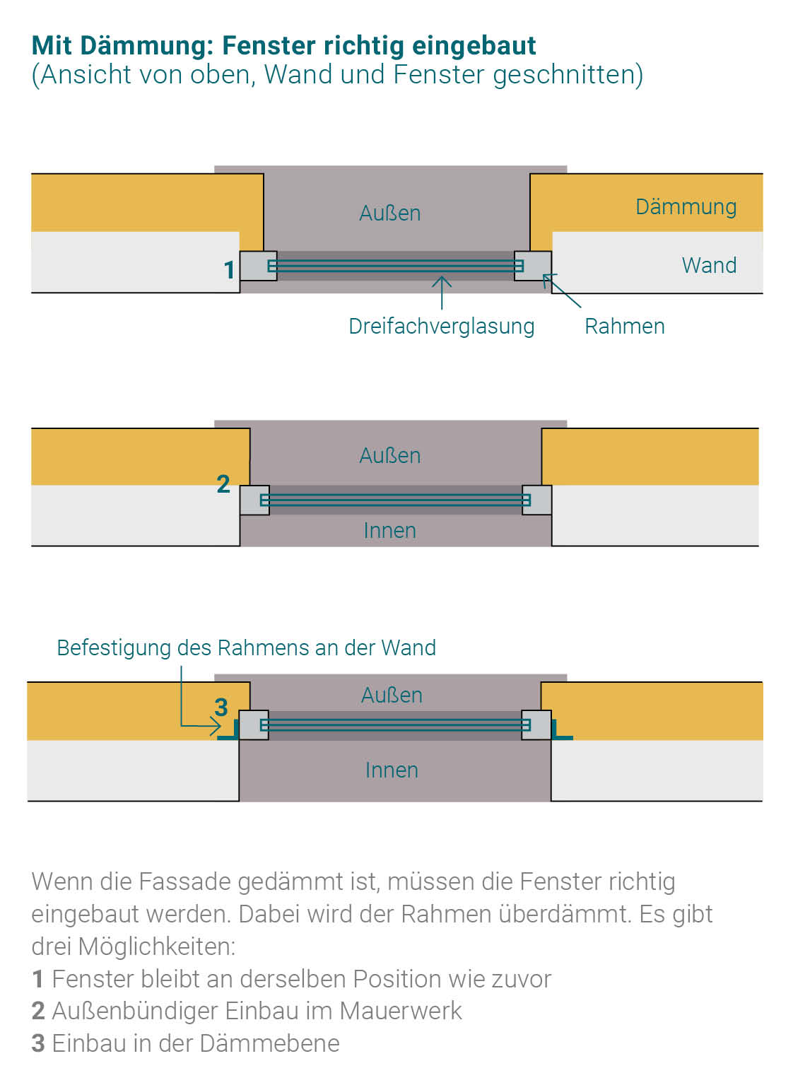 Wenn die Fassade gedämmt ist, müssen die Fenster richtig eingebaut werden. Dabei wird der Rahmen überdämmt. Die Grafik zeigt drei verschiedene Möglichkeiten.