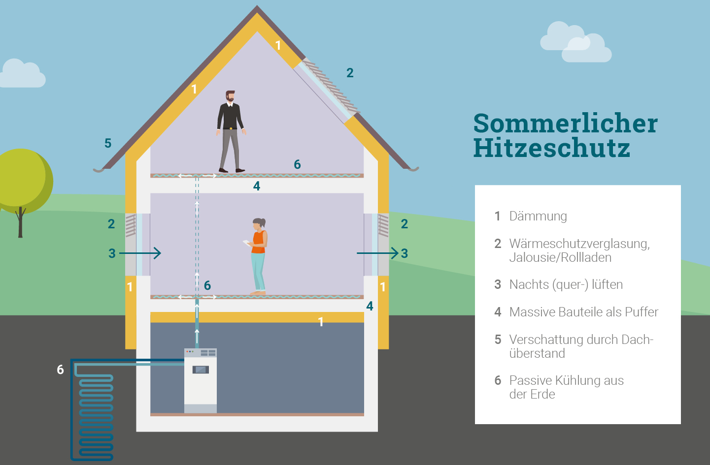 Neben dem Heizen im Winter ist auch die Kühlung im Sommer ein Thema der energetischen Gebäudesanierung. Die Grafik zeigt Elemente des sommerlichen Hitzeschutzes.