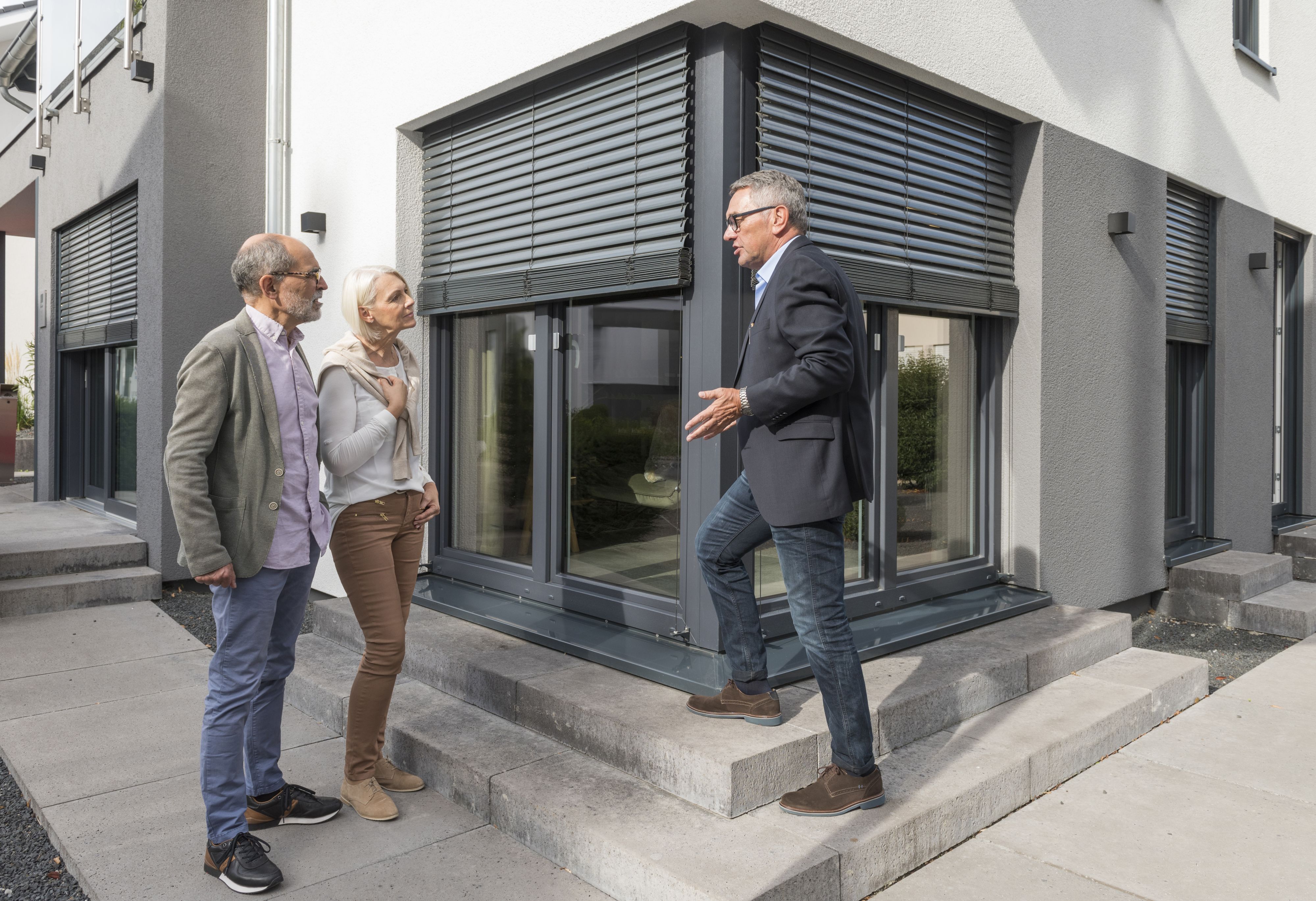Ein weiterer wirksamer Schutz gegen hohe Sonneneinstrahlung sind moderne Wärmeschutz- oder Sonnenschutzverglasungen. Dreischeibenverglasungen etwa mit dünnen, metallischen Beschichtungen auf dem Glas sorgen dafür, dass ein Großteil der Sonnenwärme erst gar nicht ins Haus gelangt. Wie gut diese Scheiben schützen, lässt sich am sogenannten g-Wert ablesen. Das g steht für Gesamtenergiedurchlassgrad. Der Wert zeigt an, wie viel Energie, in diesem Fall Sonneneinstrahlung, durch das Fenster gelangt. Ein normales Wärmeschutzglas hat einen Wert von 0,55. Das bedeutet, dass 55 Prozent der Sonnenwärme direkt ins Haus gelangen. Moderne Dreifachverglasungen haben einen Wert von etwa 0,5 und Sonnenschutzgläser bis 0,2.